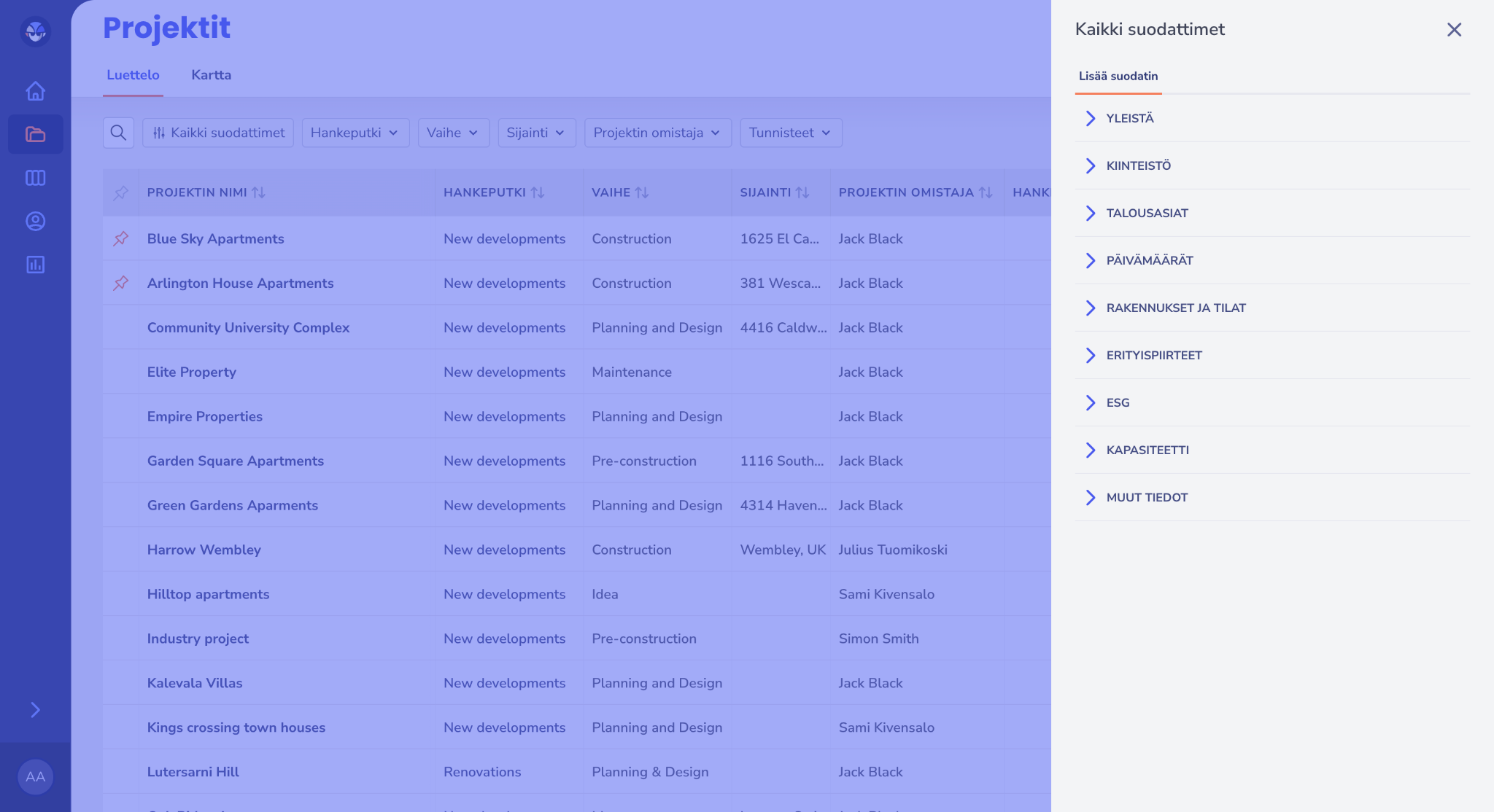 Suodattimien avulla voidaan rajata näkyviin vain tietyt hankkeet esimerkiksi vaiheen, sijainnin tai omistajan perusteella.