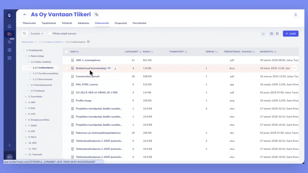 Builderheadissa voit hallita tiedostojen eri versioita selkeästi ja turvallisesti. Kaikki versiot säilyvät historiassa, ellei niitä poisteta erikseen