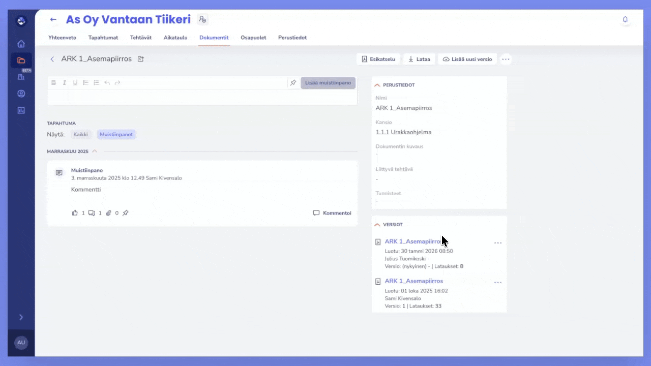 Voit lisätä dokumenttiin uuden version suoraan dokumentin alta.