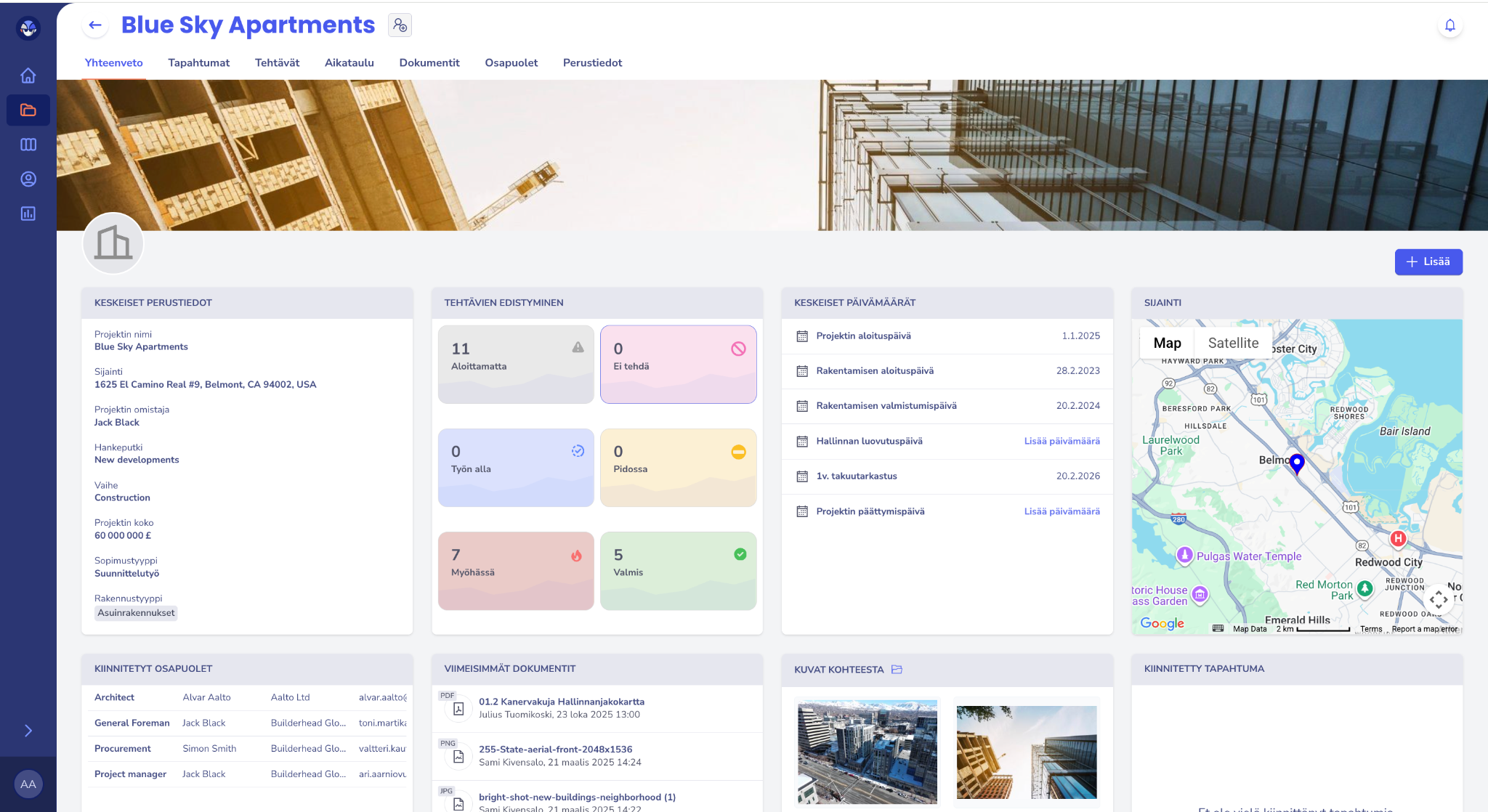 Kuvaosio esittää projektin ajantasaisia kuvia, jotka auttavat seuraamaan rakentamisen tai muun työn etenemistä visuaalisesti.